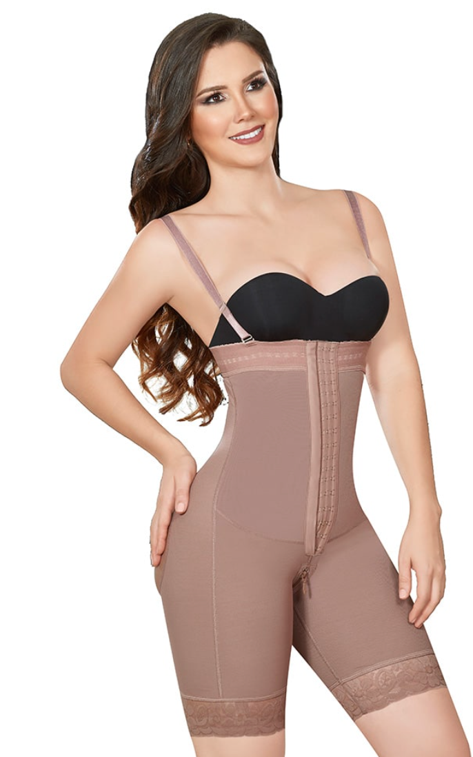 - About the garment: Ann Michell’s Vanessa mid-thigh body shaper is designed to control and smooth the abdomen, tummy, and waist without discomfort, while lifting your buttocks. This body shaper can reduce inches off your waist and stomach. It comes with adjustable and removable straps, a crotch zipper to allow you to go to the restroom without worrying about taking off your garment, a silicon lace band to prevent it from rolling up, and a butt lifter. It also has 3 hook and eye closure.